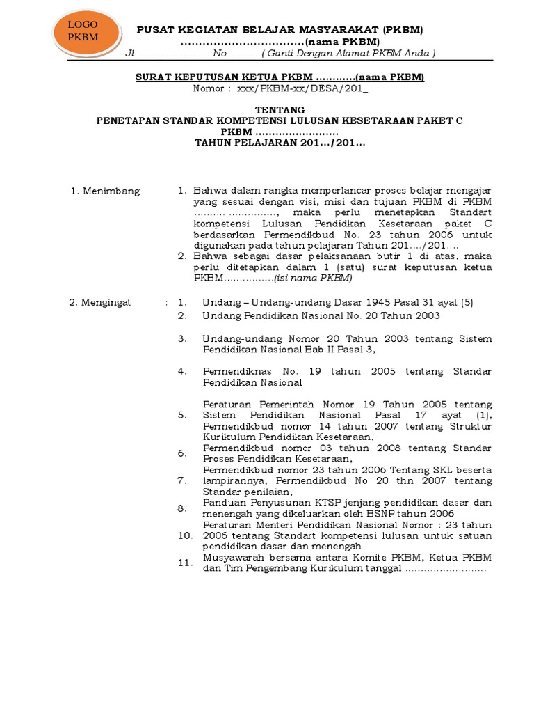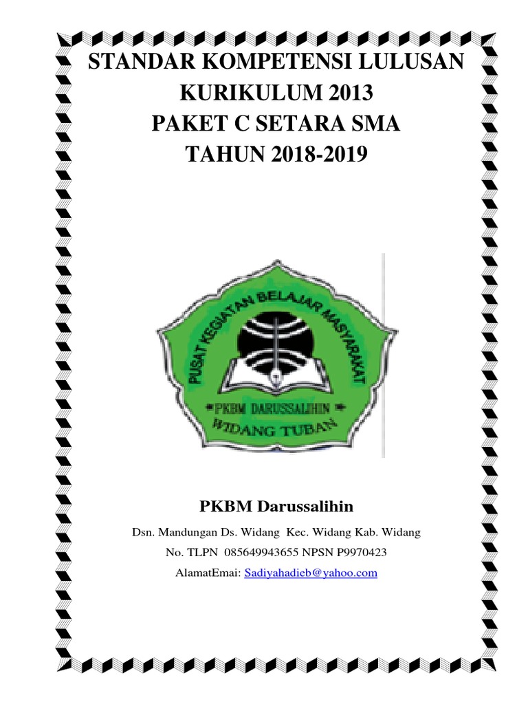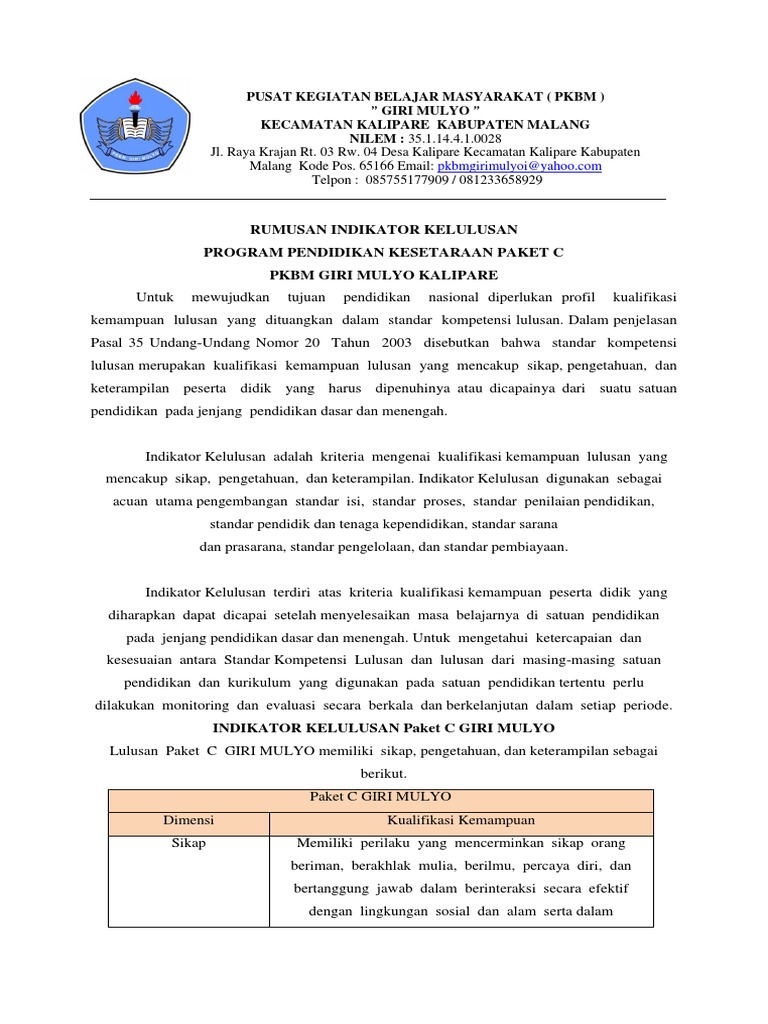 Standar Kompetensi Lulusan Program Kesetaraan Pkbm Mandiri Pkbm Mandiri