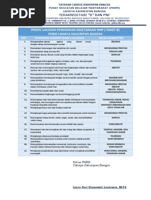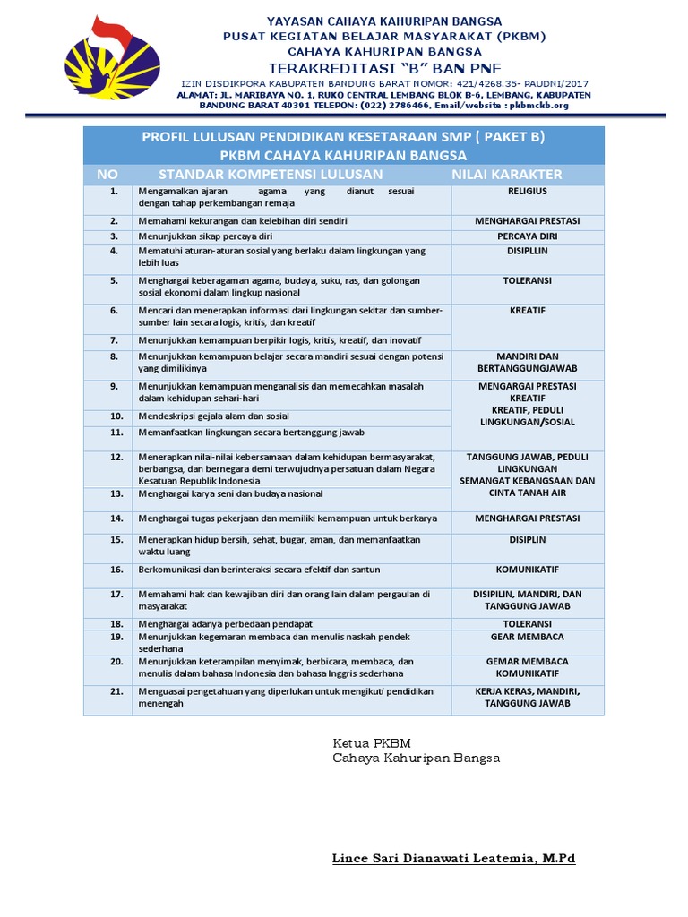 Profil Lulusan Pendidikan Kesetaraan Smp Paket B Pkbm Cahaya Kahuripan Bangsa No Standar Kompetensi Lulusan Nilai Karakter Pdf